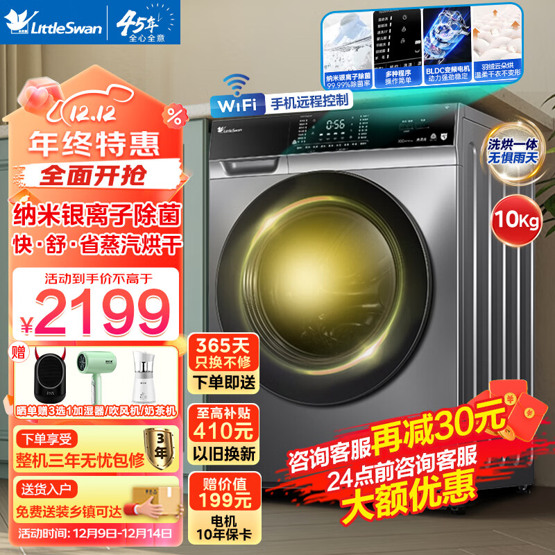 小天鹅(LittleSwan)滚筒洗衣机10公斤家用全自动洗烘一体机 纳米银离子除菌 TD100VC62WADY价格:2269.00元!