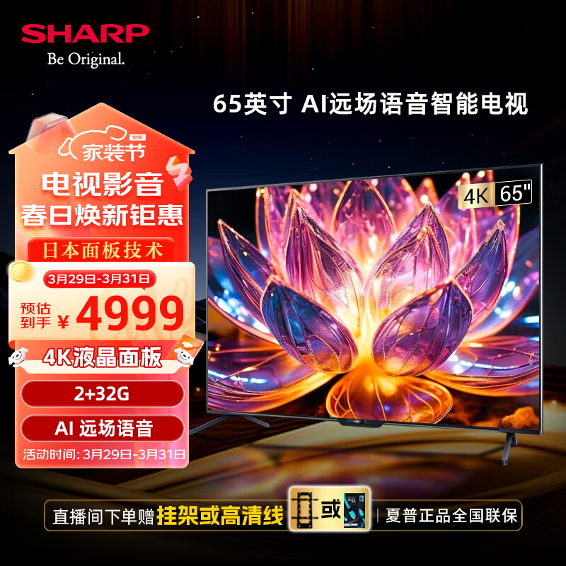 SHARP夏普65英寸 2+32G内存4K超高清 杜比音效 一键投屏 AI智能声控 屏液晶电视4T-Z65B7FA价格:4999.00元!