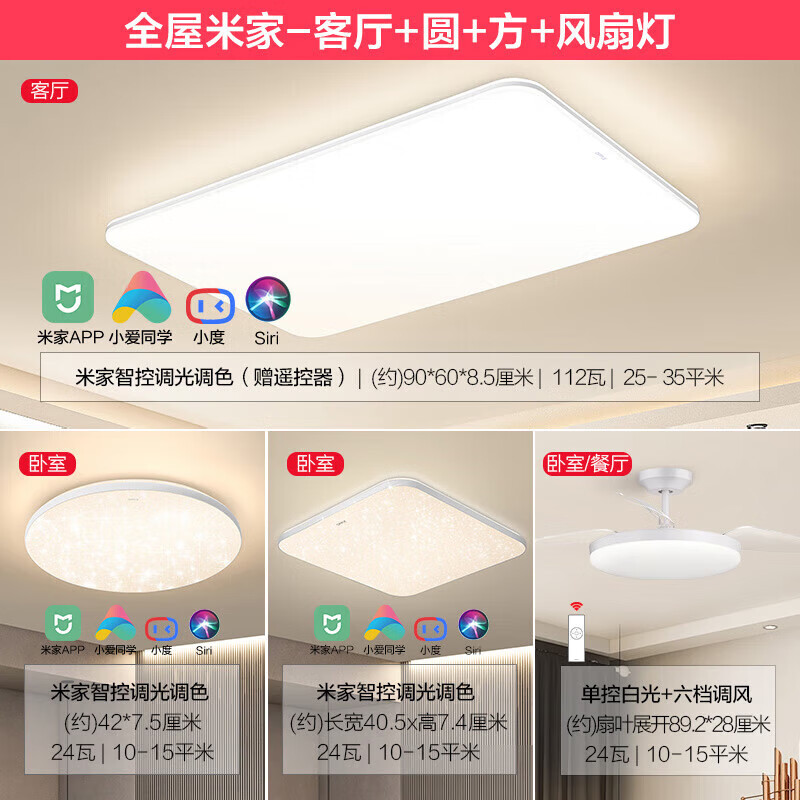 4、外观款式:外观简单大方,不管搭配什么装修风格都很合适灯光效果:灯光明亮,客厅的灯还可以无级调光。还有三色的灯光选择。操作控制:可以选择用遥控器或者开关。