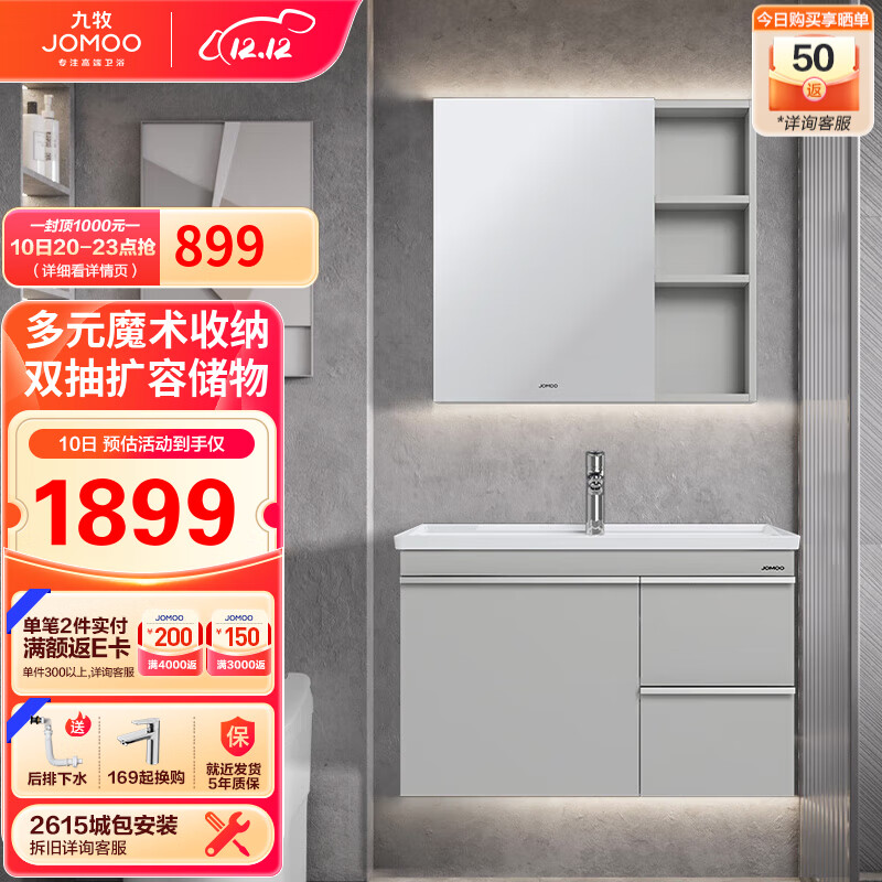 九牧(JOMOO)浴室柜 抗菌陶瓷一体盆极简悬挂式双抽拉 浅灰80cm A2704-117Y-1价格:2249.00元!