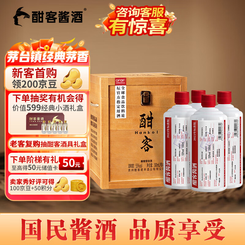 酣客 2023年标准版 酱香型白酒53度大曲 500ml*4瓶 木箱礼盒装价格:1501.00元!