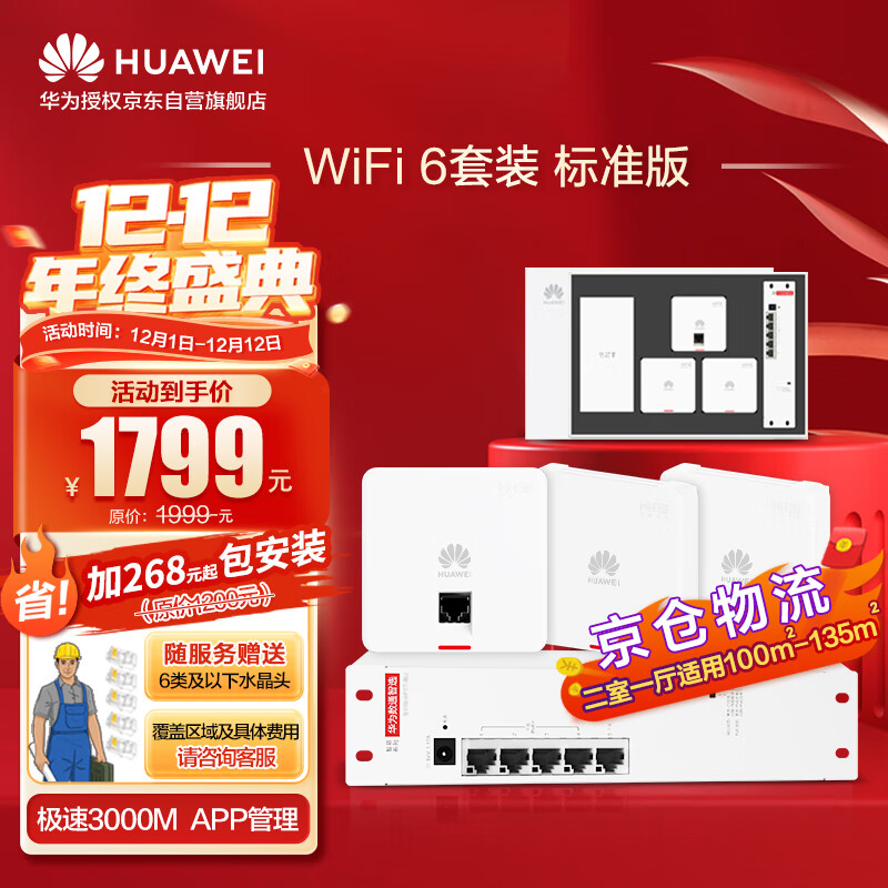 华为全屋wifi6套装标准版 3个双频千兆86无线ap面板+4口POE交换机 5g分布式路由器穿墙王企业级家用组网覆盖价格:1799.00元!