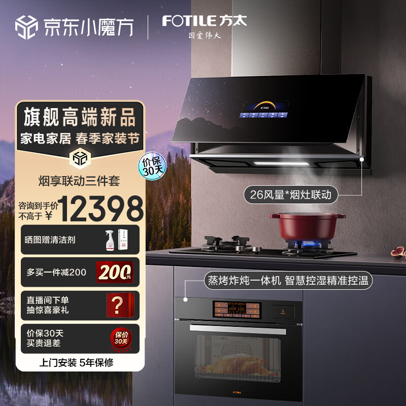 方太(FOTILE)烟灶蒸烤三件套 26大风量超薄近吸变频烟机 燃气猛火联动灶 嵌入式智控蒸烤箱柜P10.i+THF1A+EF1.i价格:12398.00元!