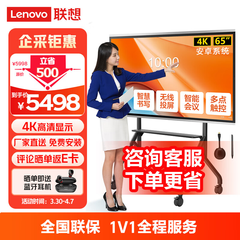 联想thinkplus 会议平板一体机 65英寸 触控屏 智能电子白板 4K高清会议电视(含笔+传屏器+移动支架)价格:4998.00元!