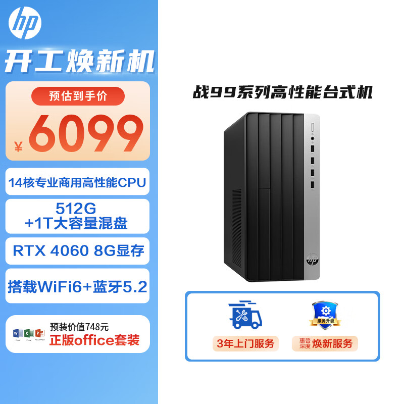 惠普(HP)战99 游戏台式电脑主机(酷睿13代i5-13500 16G 512T+1T RTX4060)14核高性能CPU价格:6099.00元!