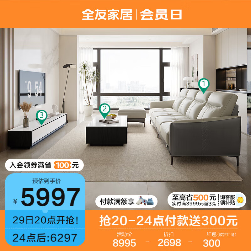 全友家居 简约客厅3件套装102710皮沙发岩板茶几电视柜主柜客厅家具价格:8995.71元!