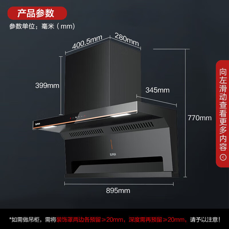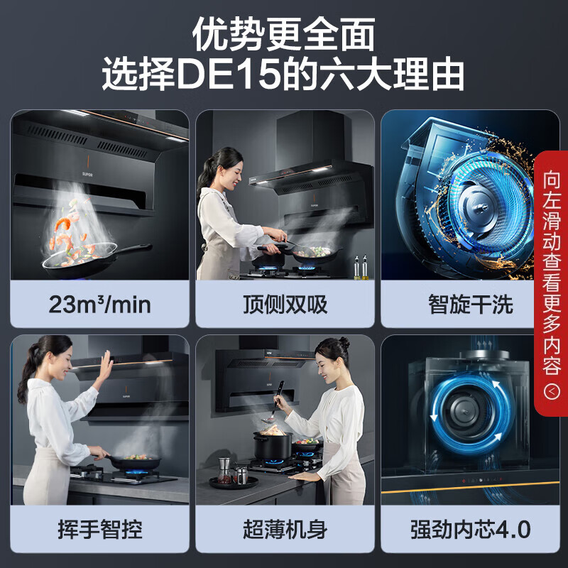 苏泊尔(SUPOR) 抽油烟机顶侧双吸油烟机7字型 23立方挥手感应免拆洗家用厨房吸油烟机 DE15单烟机价格:1447.00元!