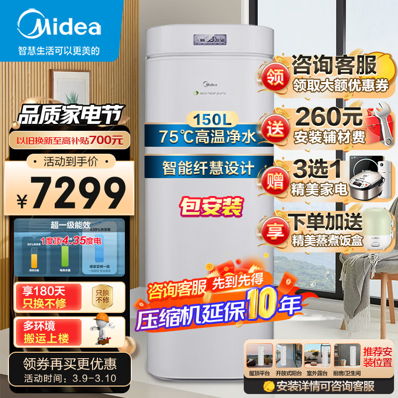 美的(Midea)空气能热水器150升包安装 一体机双源速热75°高水温WIFI智控优泉 RSJ-18/150RDN3-E2(2-4人)价格:7599.00元!