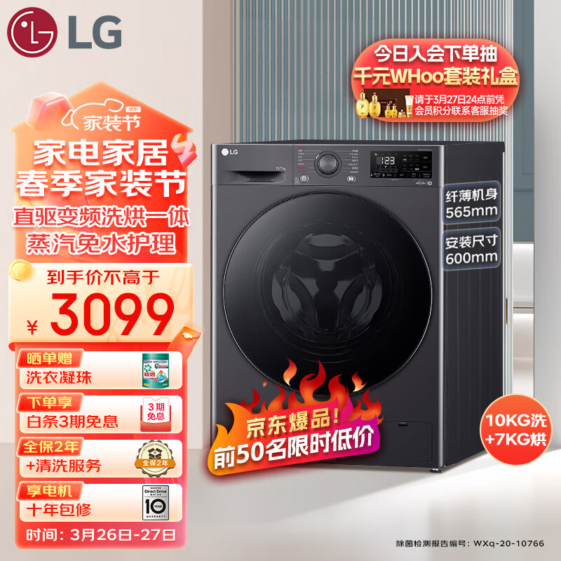 LG 星云黑 超薄洗烘一体机 10KG大容量滚筒自动洗衣机家用 蒸汽除菌 AIDD直驱变频 黑FCY10R4M价格:3099.00元!