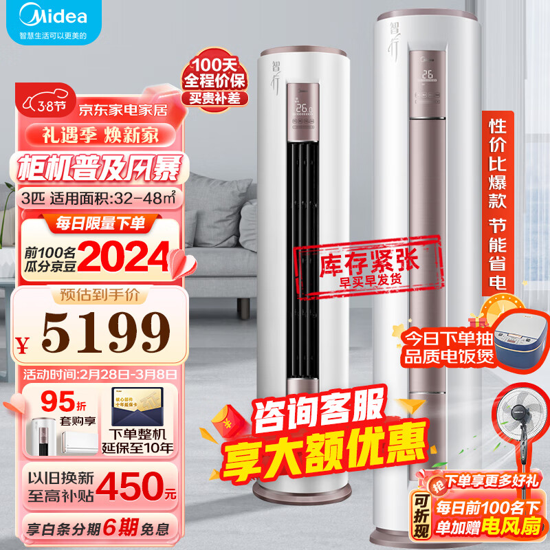 美的(Midea)3匹 新能效智能变频冷暖空调 智行圆柱立柜式空调柜机 KFR-72LW/BDN8Y-YA400(3)A价格:5399.00元!