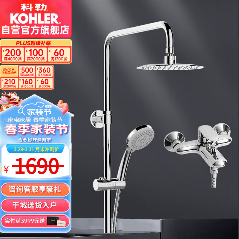 科勒(KOHLER)圆形超薄顶喷淋浴花洒套装喷头沐浴升降多功能洗澡喷头K-28582价格:2374.00元!