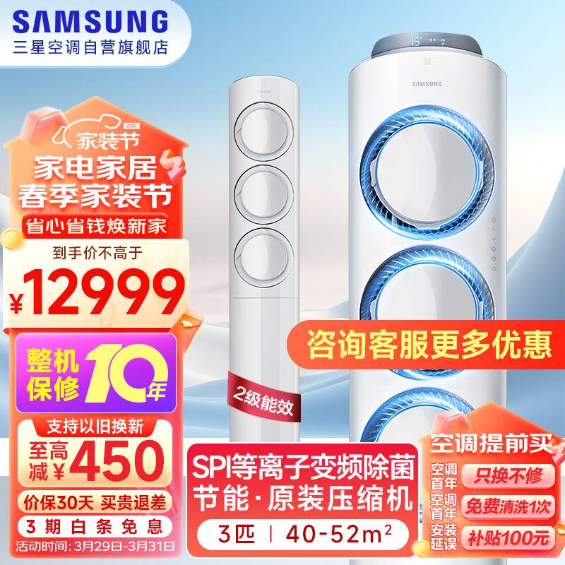 三星(SAMSUNG)40-52㎡适用 新二级能效 3匹全直流变频 离子除菌冷暖圆柱空调柜机立式 以旧换新KFR-72L/EMC1价格:13499.00元!
