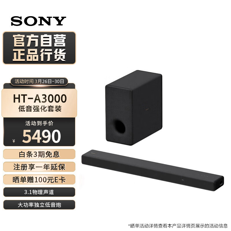 索尼(SONY)HT-A3000+SW3 低音强化套装 全景声 4K 无线家庭影院 Soundbar 回音壁 客厅卧室 电视/无线音响价格:5490.00元!