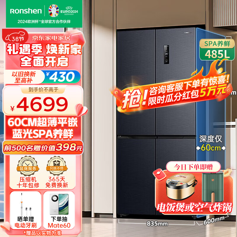 容声冰箱485升十字对开四开门超薄60CM可嵌入式电冰箱家用变频一级能效BCD-485WD1FPQ超大容量价格:4999.00元!