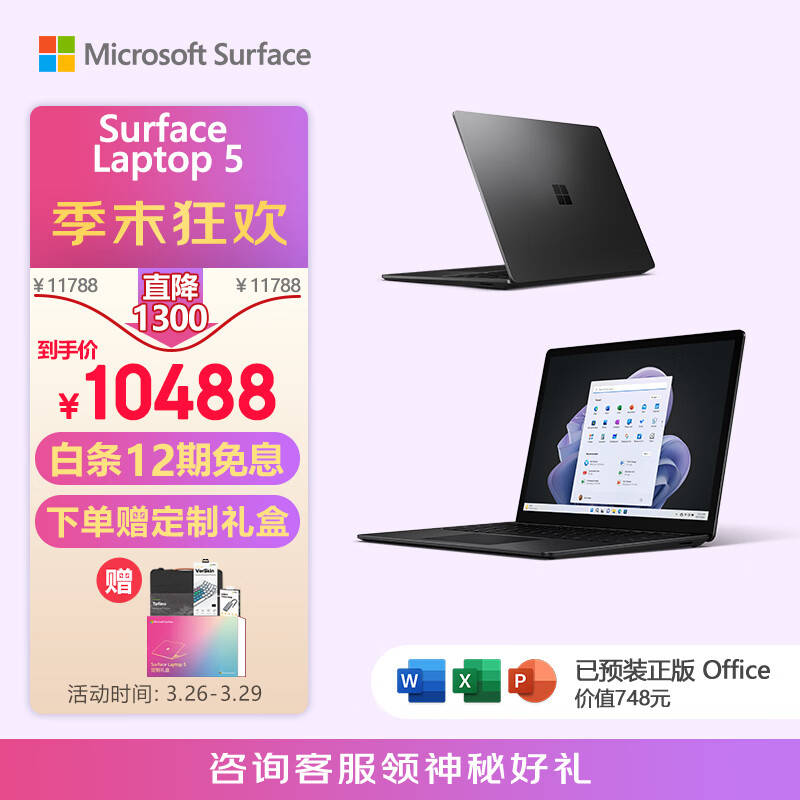 微软Surface Laptop 5轻薄笔记本电脑 i5 16G+512G 典雅黑 Evo认证13.5英寸2.2K高色域触控屏价格:10488.00元!