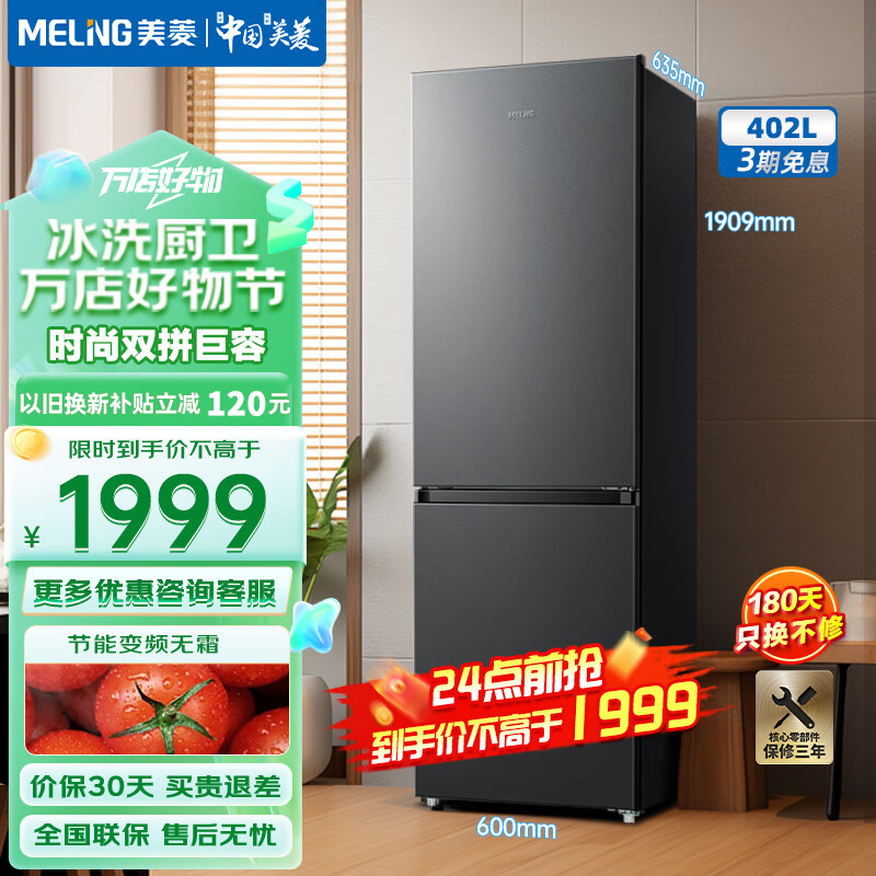 美菱(MeiLing)冰箱402升双门两门冰箱双变频风冷无霜大容量可拼接无缝窄门家用冷藏冷冻电冰箱 BCD-402WPCX典雅灰价格:1999.00元!