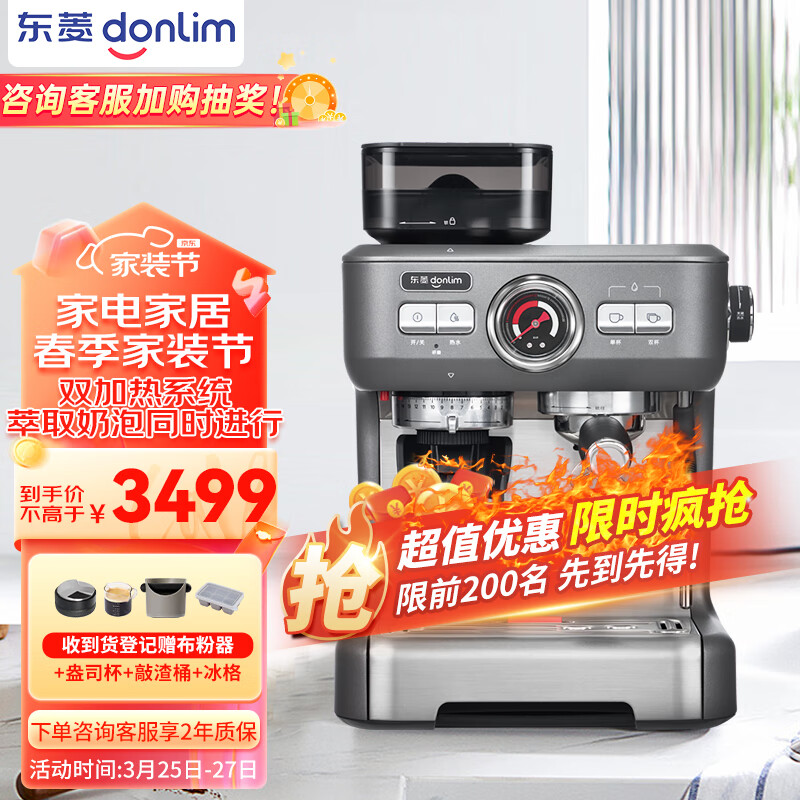 东菱(Donlim)咖啡机 咖啡机家用 意式半自动 双加热系统 研磨一体 蒸汽打奶泡 好礼推荐 DL-5700D钛金灰价格:3859.00元!