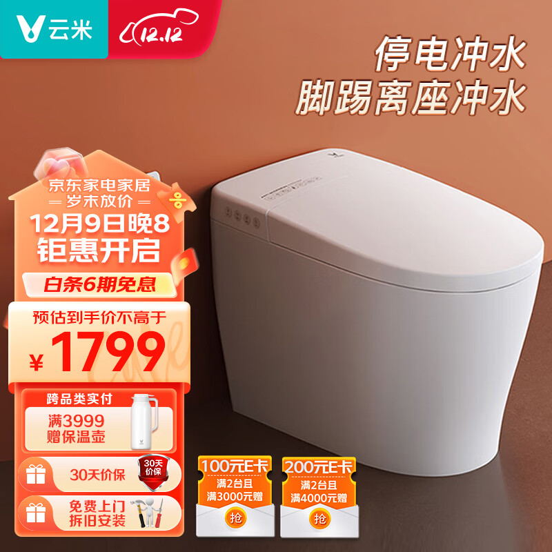 云米智能马桶一体机恒温座圈自动冲洗智能坐便器小鲸鱼400坑距价格:1799.00元!