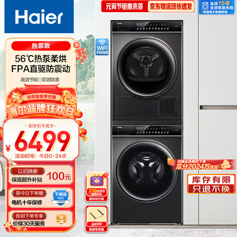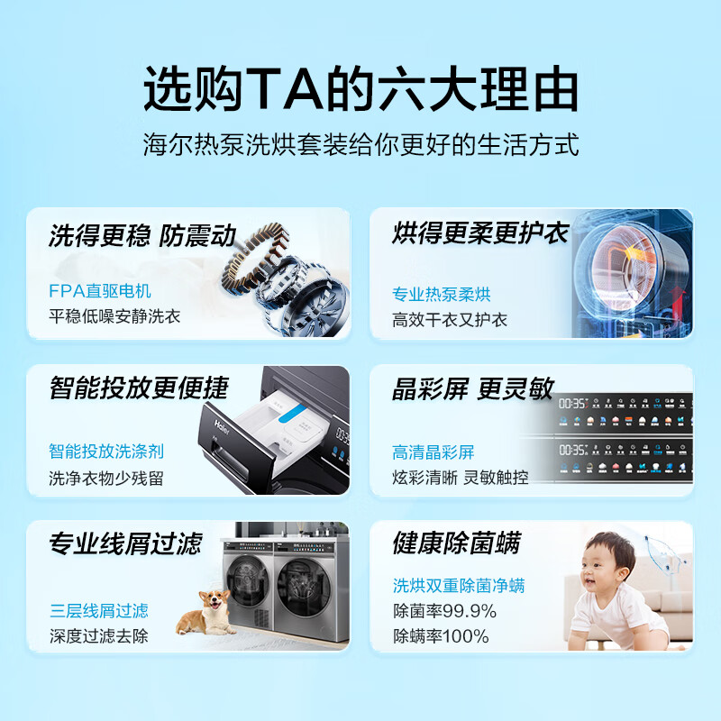 海尔(Haier)晶彩洗烘套装1.08洗净比10Kg滚筒洗衣机+热泵烘干机家用 空气洗 京东小家EG100BDC189SU1组合价格:6499.00元!