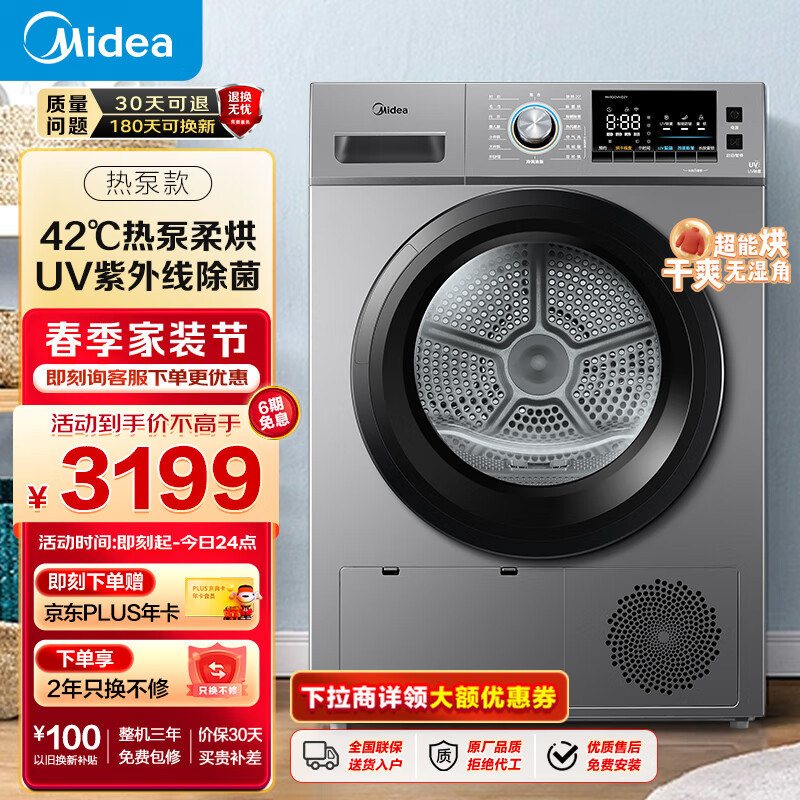 美的(Midea)烘干机 家用热泵式干衣机 10公斤 紫外线除菌 除螨除潮 祛除宠物毛发 MH100VH03Y价格:3399.00元!