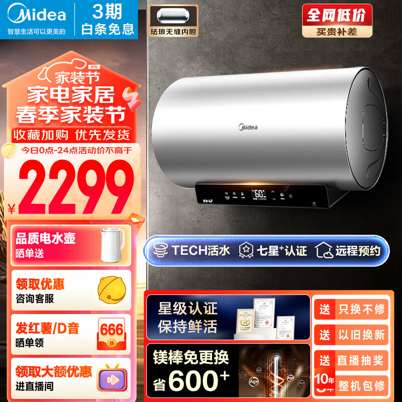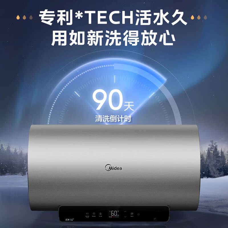 美的(Midea)专利TECH活水系列60升电热水器 免换镁棒储水式3300W一级能效节能智能7星认证云管家F6033-HQ(HE)价格:2299.00元!