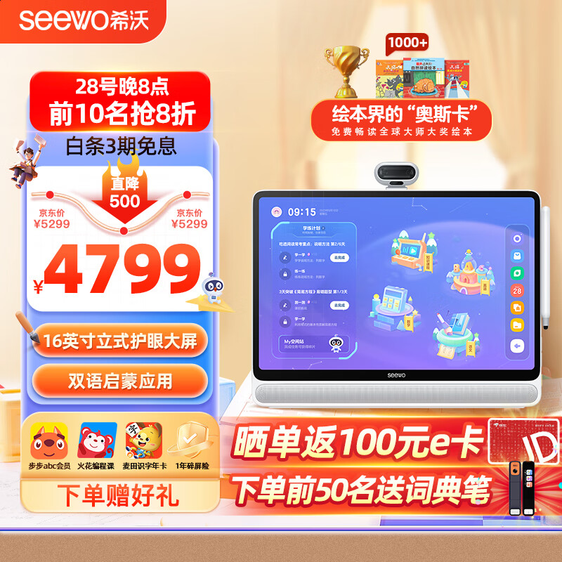 希沃学习机W3类纸护眼大屏儿童学习机学生平板电脑小学到高中课程同步AI英语学习早教机8G+128G皓月白价格:4699.00元!