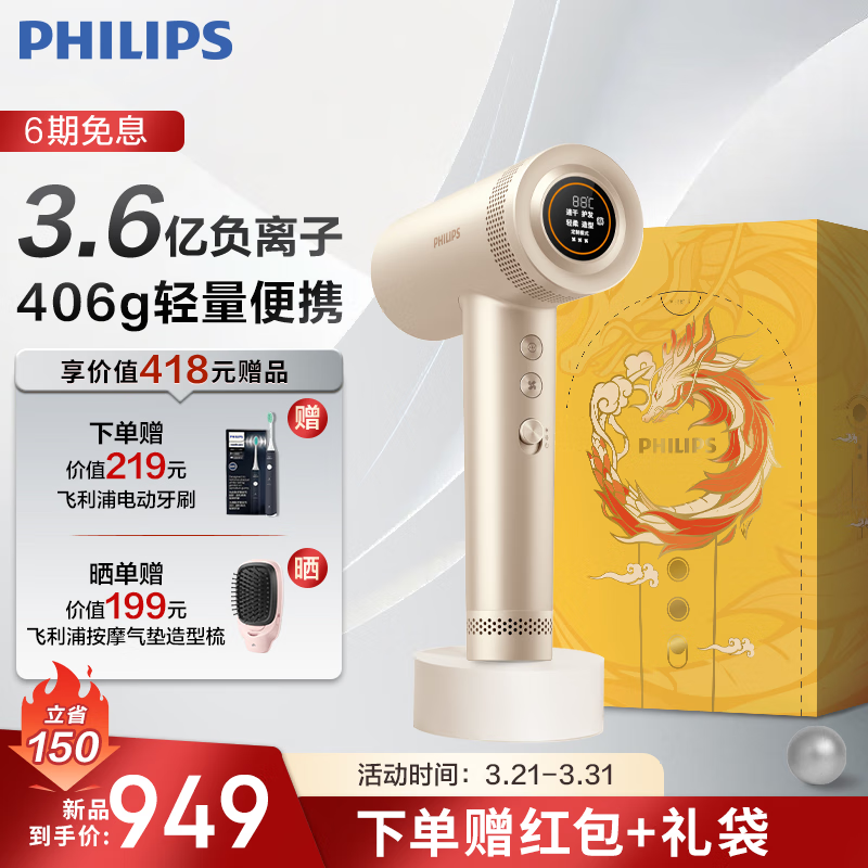 飞利浦(PHILIPS)高速电吹风机 7系pro 鎏金筒 3.6亿负离子 头皮柔护科技 家用速干护发 礼物推荐 香槟金价格:949.00元!