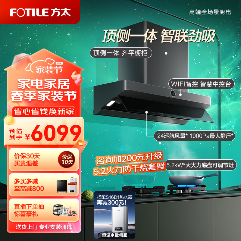 方太(FOTILE)抽吸油烟机灶具套装 顶侧吸一体欧式 变频烟灶24巡航风量5.2kW燃气灶套餐01-F2.i+02-TH27B天然气价格:6099.00元!