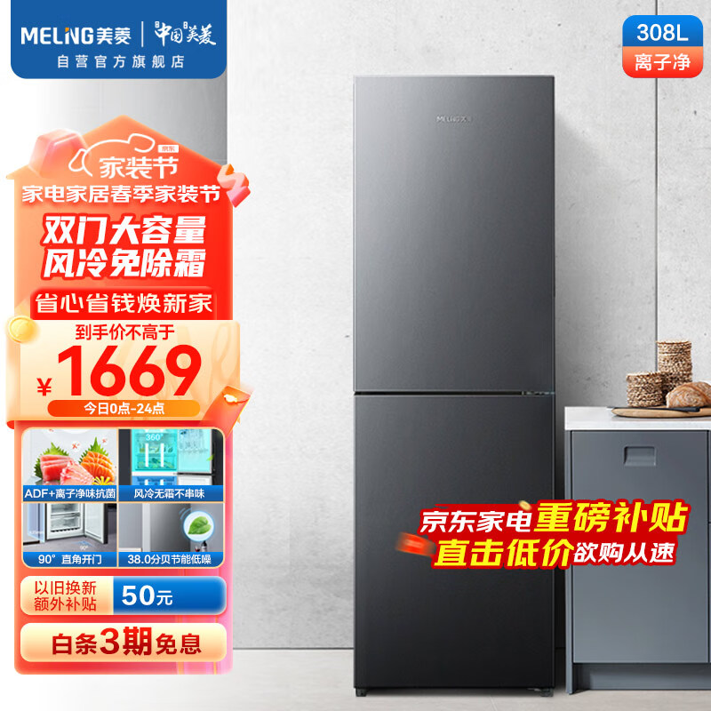 美菱(MELING)【离子净系列】308升双门两门小型电冰箱 家用风冷无霜节能低噪净味大容量 BCD-308WECX价格:1669.00元!