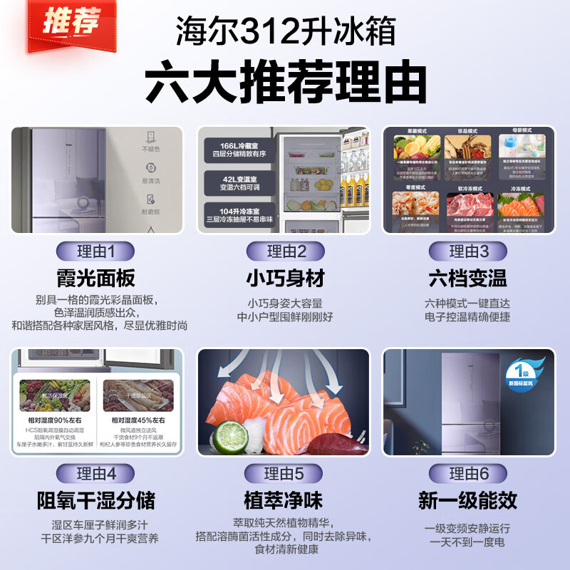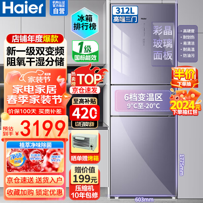 海尔(Haier)冰箱312升家用三门大容量风冷无霜一级能效双变频净味除菌六档变温干湿分储玻璃面板BCD-312WFCM价格:3298.00元!
