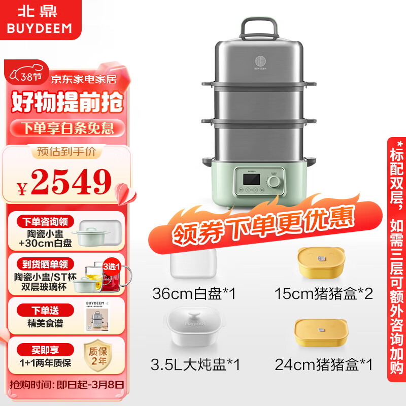 北鼎(Buydeem)蒸炖锅家用电蒸锅大号智能蒸箱婴儿辅食锅【全家福套装】G68+大炖盅+大蒸盘+黄色猪猪饭盒*3价格:2549.00元!