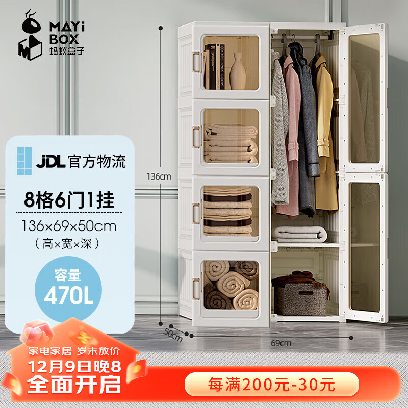 蚂蚁盒子(MAYIHEZI)免安装可折叠塑料成人简易衣柜出租房衣服收纳防尘防潮 8格6门1挂价格:489.00元!