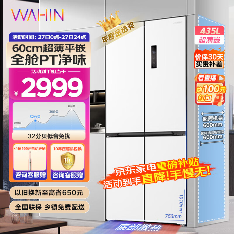华凌 美的冰箱出品60cm超薄平嵌入456十字四门大容量全舱PT净味白色低音底部散热家用冰箱HR-456WUSPZ价格:2999.00元!