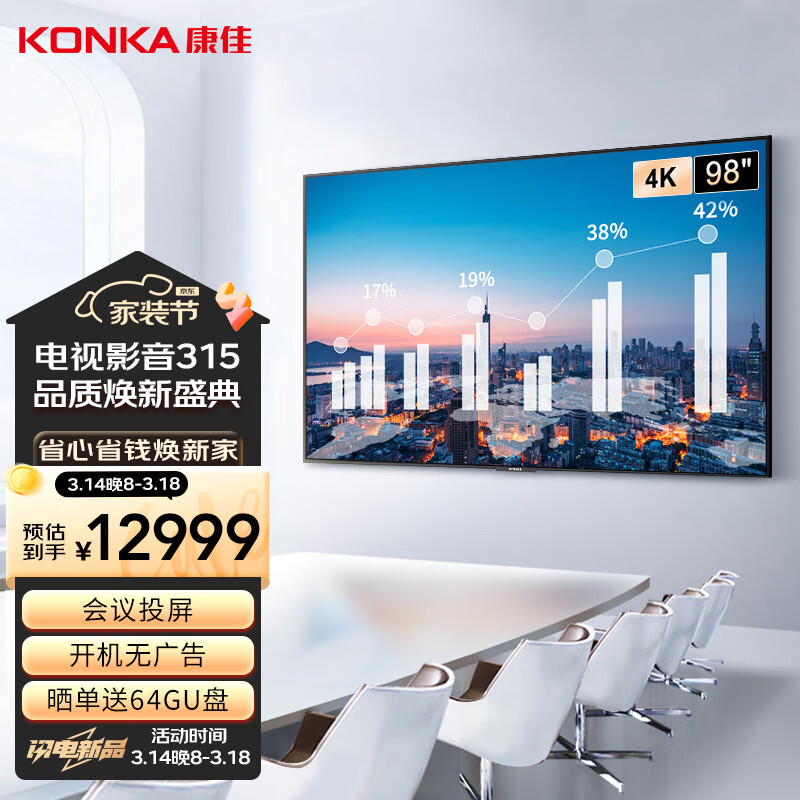 康佳98英寸会议电视平板移动显示大屏 办公无线投屏 4K超高清商用智慧屏 开机直达 98X6价格:12999.00元!