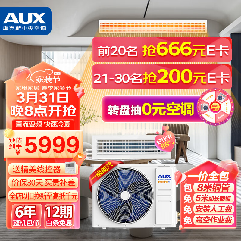奥克斯(AUX)风管机一拖一3匹中央空调一级能效直流变频客厅卧室嵌入式空调GRD72/BPR3YA(B1)价格:5999.00元!