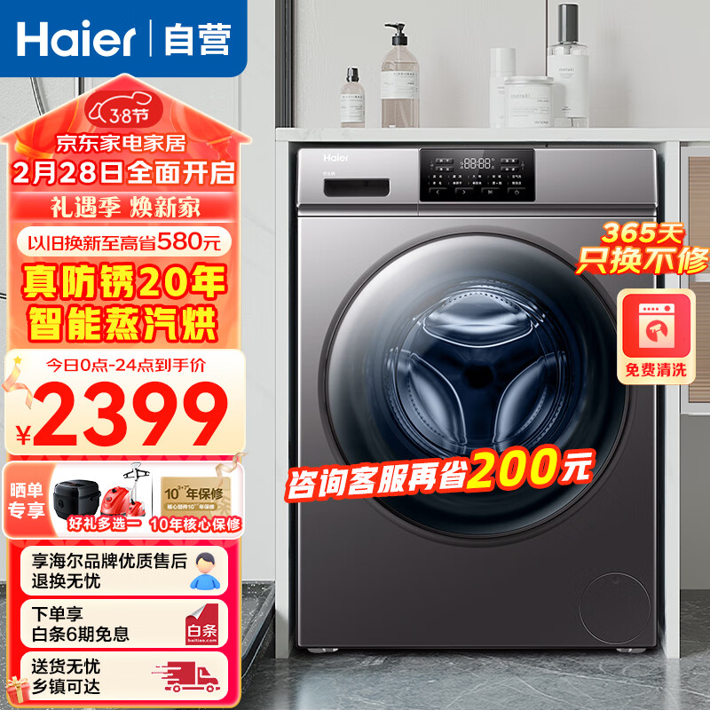 海尔(Haier)10公斤洗衣机洗烘一体全自动滚筒家用变频节能除菌螨洗衣机防生锈筒自洁空气洗价格:2399.00元!