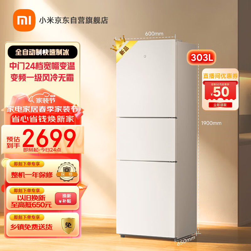 米家小米303L三门精巧装全自动制冰冰箱小型 冰羽白磨砂面板极简百搭风冷无霜一级能效BCD-303WMSA价格:2699.00元!
