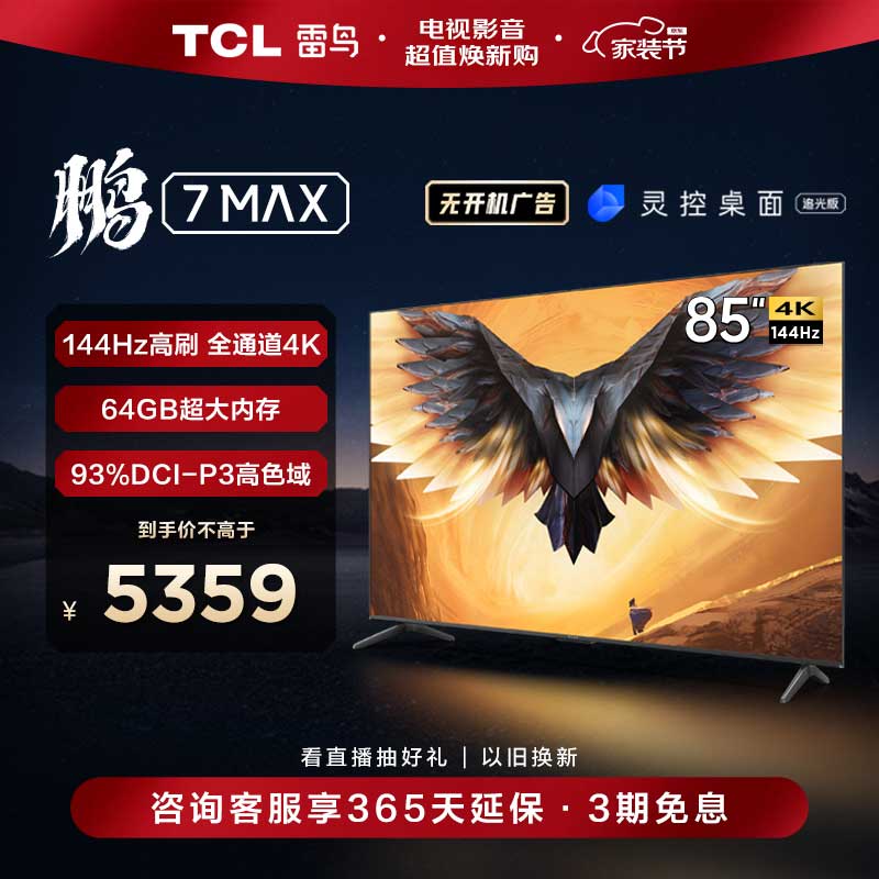 TCL雷鸟 鹏7MAX 85英寸游戏电视 144Hz高刷 HDMI2.1 3+64GB 4K超高清 液晶巨幕平板客厅电视机85S575C价格:5359.00元!
