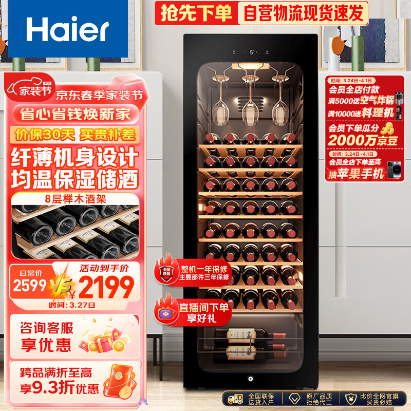 海尔(Haier)150升52瓶装恒温红酒柜 客厅办公室葡萄酒冷藏家用酒柜WS052WGHUD1价格:2499.00元!