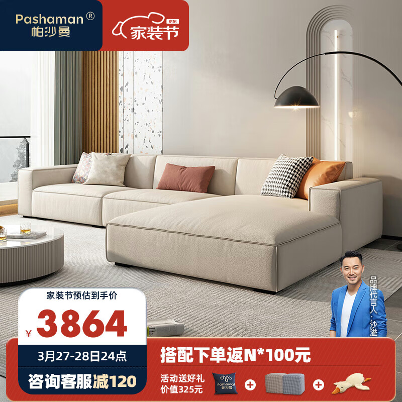 帕沙曼 猫抓布艺沙发现代简约大户客厅奶油风豆腐块科技布贵妃3.4米3185价格:3864.00元!