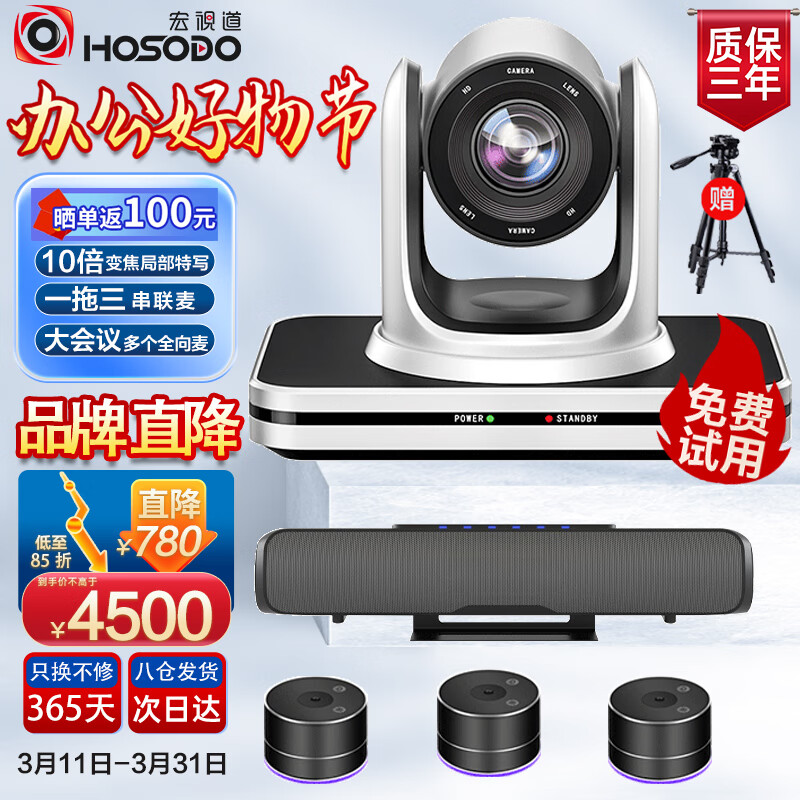 宏视道大型视频会议室解决方案 适用80-100㎡高清摄像头/10倍变焦摄像机/无线全向麦克风级联一拖三TZ4价格:5280.00元!