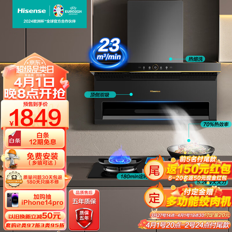 海信(Hisense)油烟机灶具套装 顶侧双吸天然气燃气灶套装 23立方挥手排油烟机5.2kW定时燃气灶DS11+DB33以旧换新价格:1849.00元!