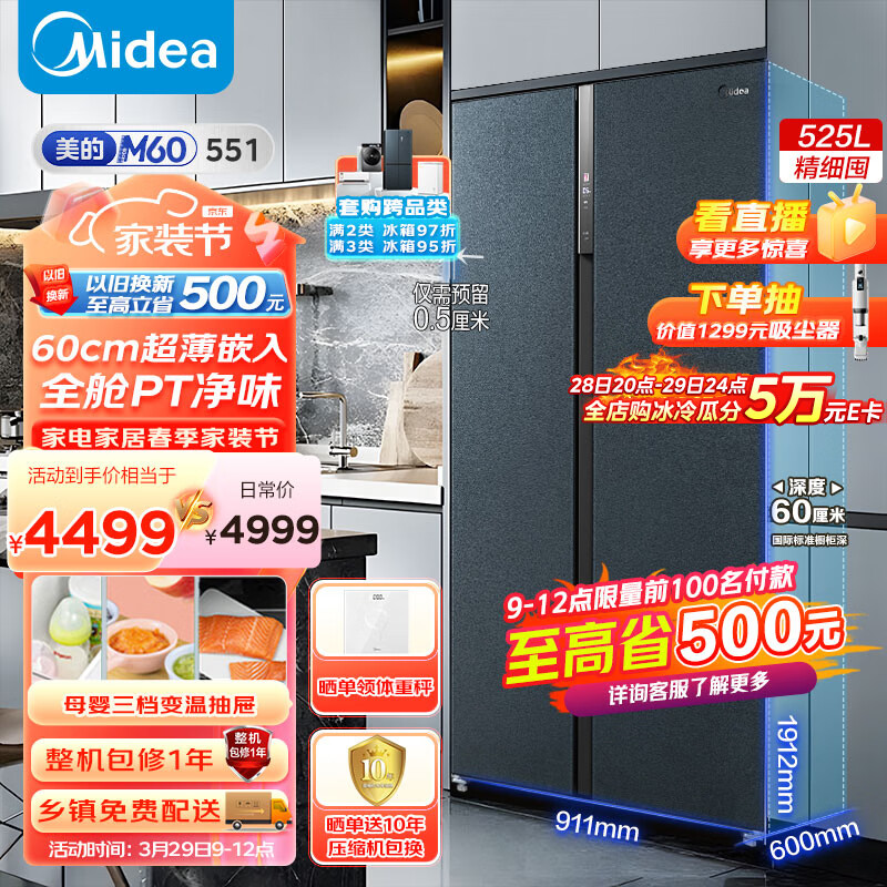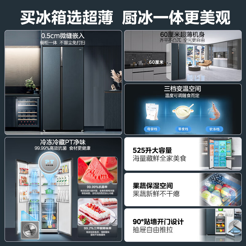 美的(Midea)M60系列60cm薄系列525升对开门双开门超薄嵌入净味家用智能电冰箱变频一级能效MR-551WUKPZE大容量价格:5599.00元!