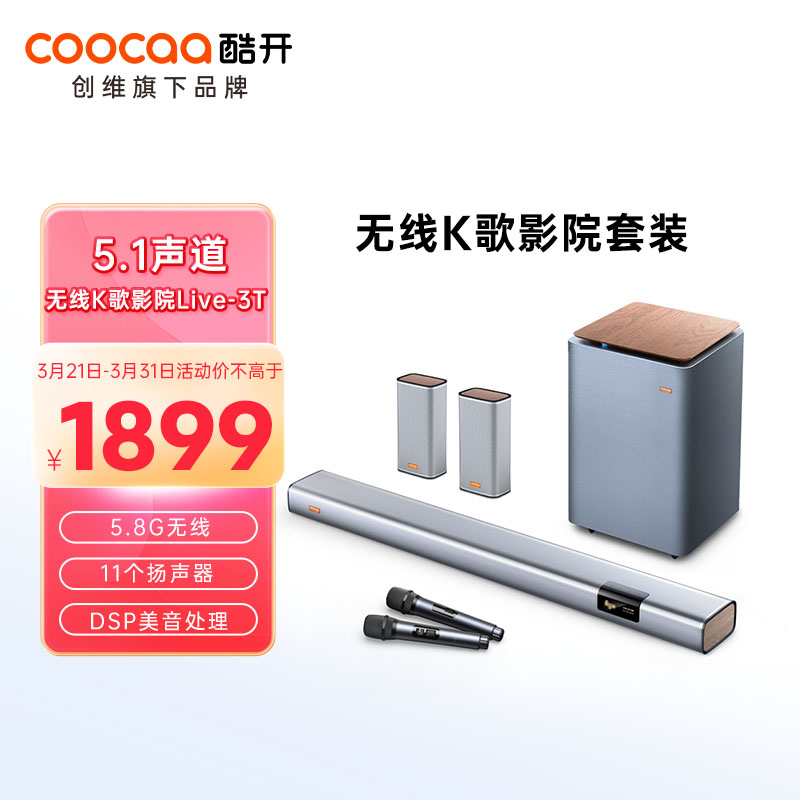 酷开(coocaa)创维出品Live-3T 家庭KTV 电视音响 回音壁 家庭影院5.1 无线低音炮 3D环绕家用K歌卡拉OK音箱套装价格:2699.00元!