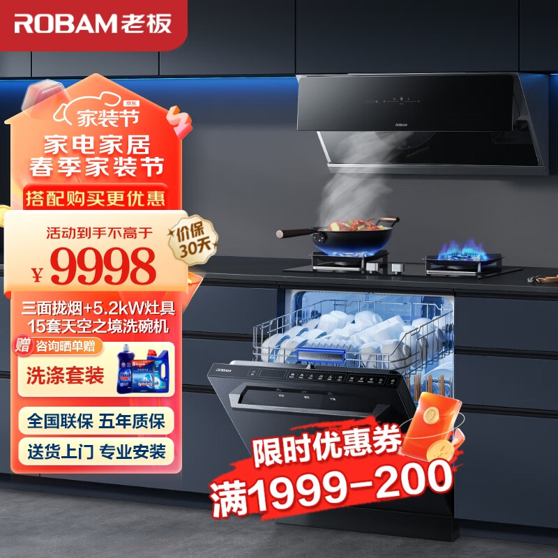 老板(Robam)探索家D7S变频 24大风量侧吸抽油烟机15套洗碗机嵌入式独立式两用厨房多件套28D7S+57B6DT+F80D黑价格:9998.00元!