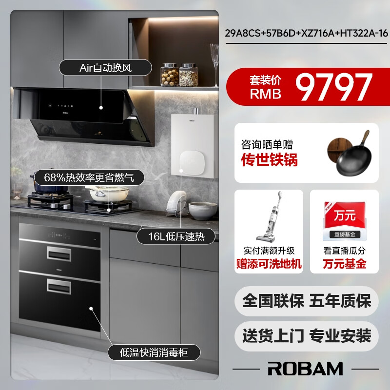 老板(Robam)厨房多件套抽油烟机智能变频25风量挥手 灶具消毒柜燃气热水器29A8CS+57B6DT+XZ716A+HT322A-16价格:9797.00元!