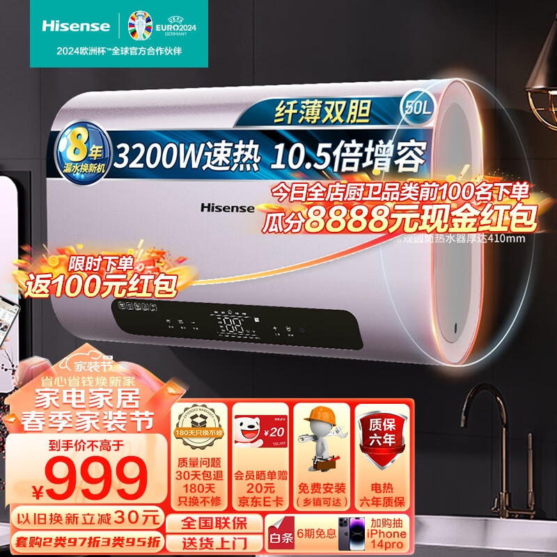 海信(Hisense)纤薄扁桶50升家用电热水器 超薄双胆 3200W速热 变频节能 10倍增容 WIFI智控W5210i智享 以旧换新价格:1399.00元!