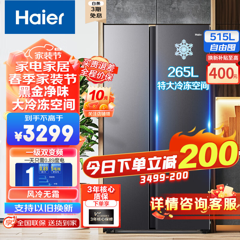 海尔(Haier)515升超大冷冻空间冰箱 双开门大容量 一级能效 变频风冷无霜对开门冰箱 黑金净化 超薄 以旧换新价格:3499.00元!