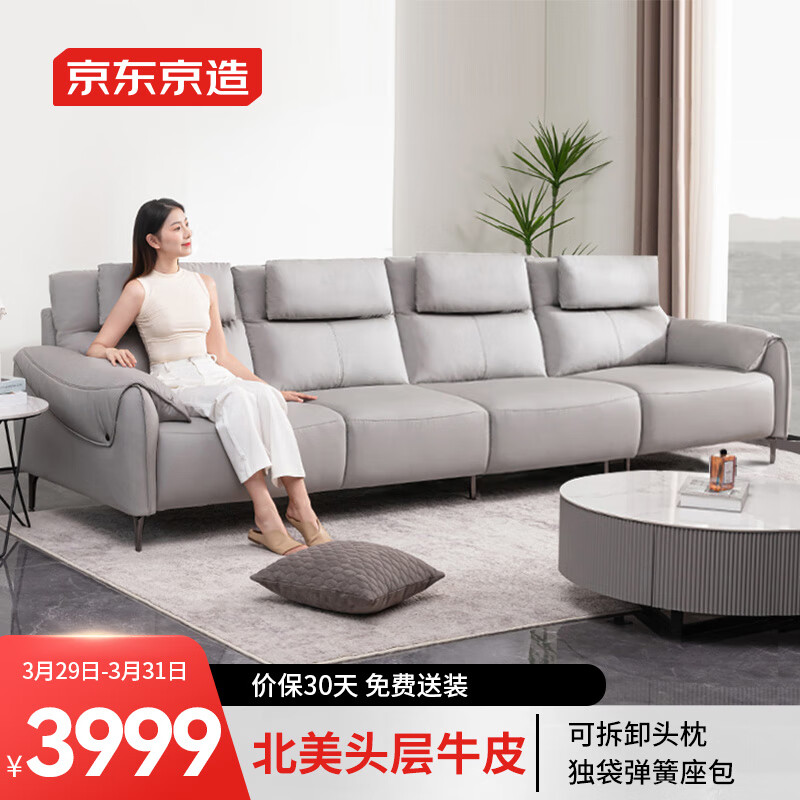 京东京造真皮沙发 北美头层牛皮可拆卸头枕弹簧座包 客厅大户型3.4m灰ST08价格:4699.00元!