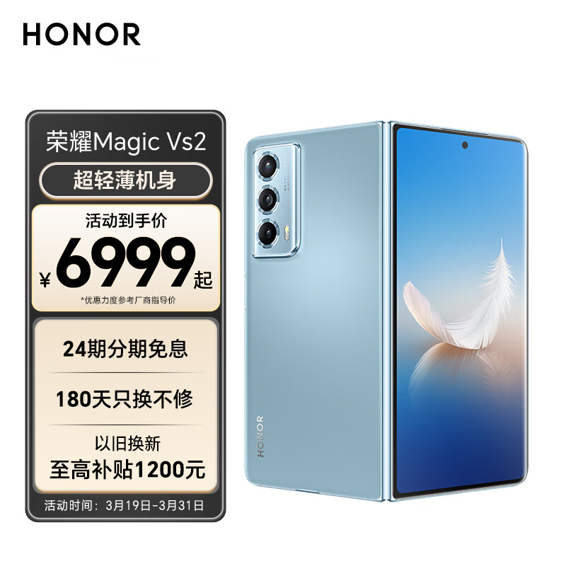 荣耀Magic Vs2 超轻薄机身 零风险调光护眼双屏 5000mAh超长续航 5G 折叠屏手机 12GB+256GB 冰川蓝价格:6999.00元!